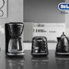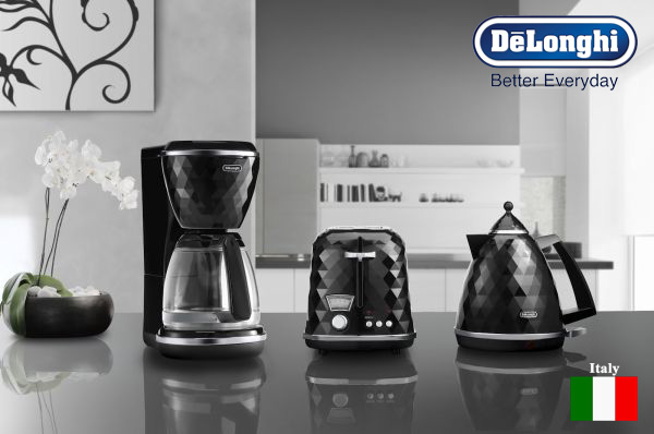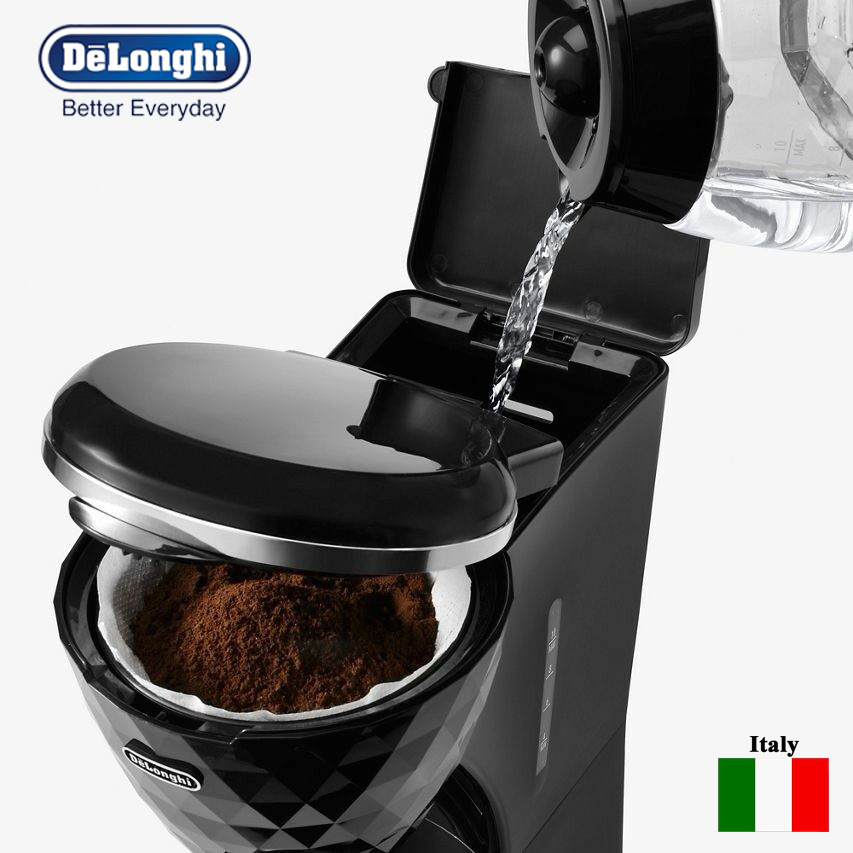 Pure jet black Brillante 10 cups drip coffee maker. A real piece of art in your kitchen, thanks to the three dimension design, the reflection of light from the round-cut body and the elegant chromed details